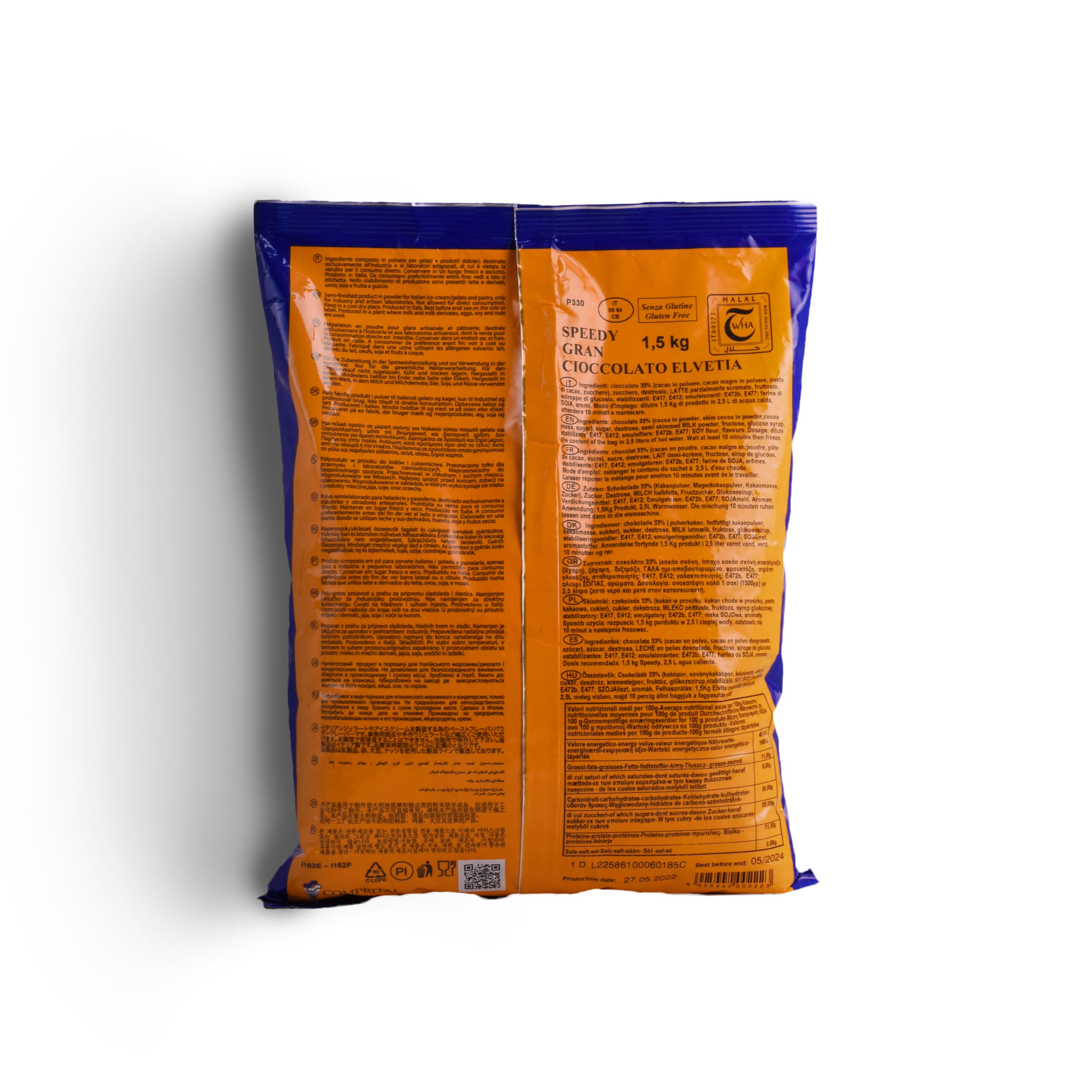 [PURE CHOCOLATE, READY-TO-USE] 1.5KG Comprital Speedy Gran Cioccolato Elvetia Gelato Mix is a ready-to-use powder that delivers a rich, decadent chocolate taste. Made from 70% pure chocolate obtained through a special process, it maintains the same flavor profile as the best Swiss chocolate. There is a perfect balance between the taste and aroma profile of this gelato mix, which is creamy and chocolatey with a velvety texture that melts in your mouth. With a medium flavor intensity, it is a perfect choice for those who enjoy chocolate but do not wish it to be overwhelming. The pure chocolate gelato mix is an excellent choice for food, beverage, and dessert businesses seeking to provide their customers with a high-quality chocolate gelato product. By diluting the powder with hot water, it is easy to prepare a gelato that has excellent organoleptic and structural qualities that is sure to satisfy customers. Among the culinary applications of the Speedy Gran Cioccolato Elvetia Gelato Mix are a variety of desserts that can be prepared using it, including classic gelato, gelato sandwiches, gelato sundaes, and gelato cakes, as well as more creative options. Furthermore, it can be used to prepare chocolate drinks including milkshakes, smoothies, and affogato. Dessert applications might include chocolate gelato sandwiches with chocolate cookies, while beverages might include a hot espresso-topped scoop of chocolate gelato. Comprital Speedy Gran Cioccolato Elvetia Gelato Mix provides a taste sensation that will delight customers with its irresistible chocolate experience. Businesses looking to add high-quality chocolate gelato to their menu will find it to be an excellent choice due to its creamy texture and balanced flavor. Additionally, it can be used to prepare an array of unique and delicious treats for the culinary, beverage, and dessert industries. • net weight: 1.5 kg • sold per unit; 10 units per box • shelf life: two (2) years • storage condition: store tightly closed under cool, dry conditions; avoid exposure to sunlight; recommended storage temperature: 20˚C – 35˚C • allergen declaration: produced in a facility where milk and milk derives, eggs, soy and nuts are used. • product information: gluten-free, halal certified