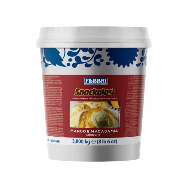 The Fabbri 1905 Snackolosi Crunchy Mango and Macadamia Marbling-Filling Paste combines the vibrant sweetness of Alphonso mango with the crunch of toasted macadamia nuts. Ideal for gelato, pastries, and confectionery applications, this gluten-free, palm oil-free paste delivers a distinct texture and flavor profile.