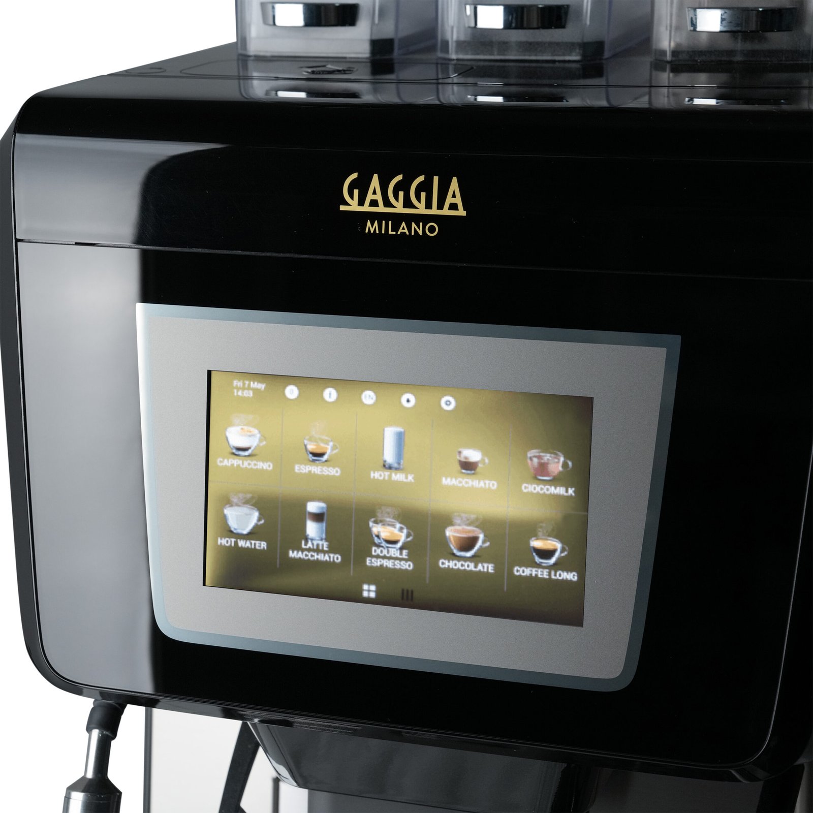 This Gaggia Milano coffee machine integrates advanced PrimeMilk technology for flawless milk foaming and an intuitive 7-inch touch display for effortless customization. Lattevelluto craftsmanship ensures velvet-like milk textures, while automated cleaning cycles maintain hygiene with low water usage. Designed with LED accents and stainless steel components, it embodies elegance while delivering practical reliability.