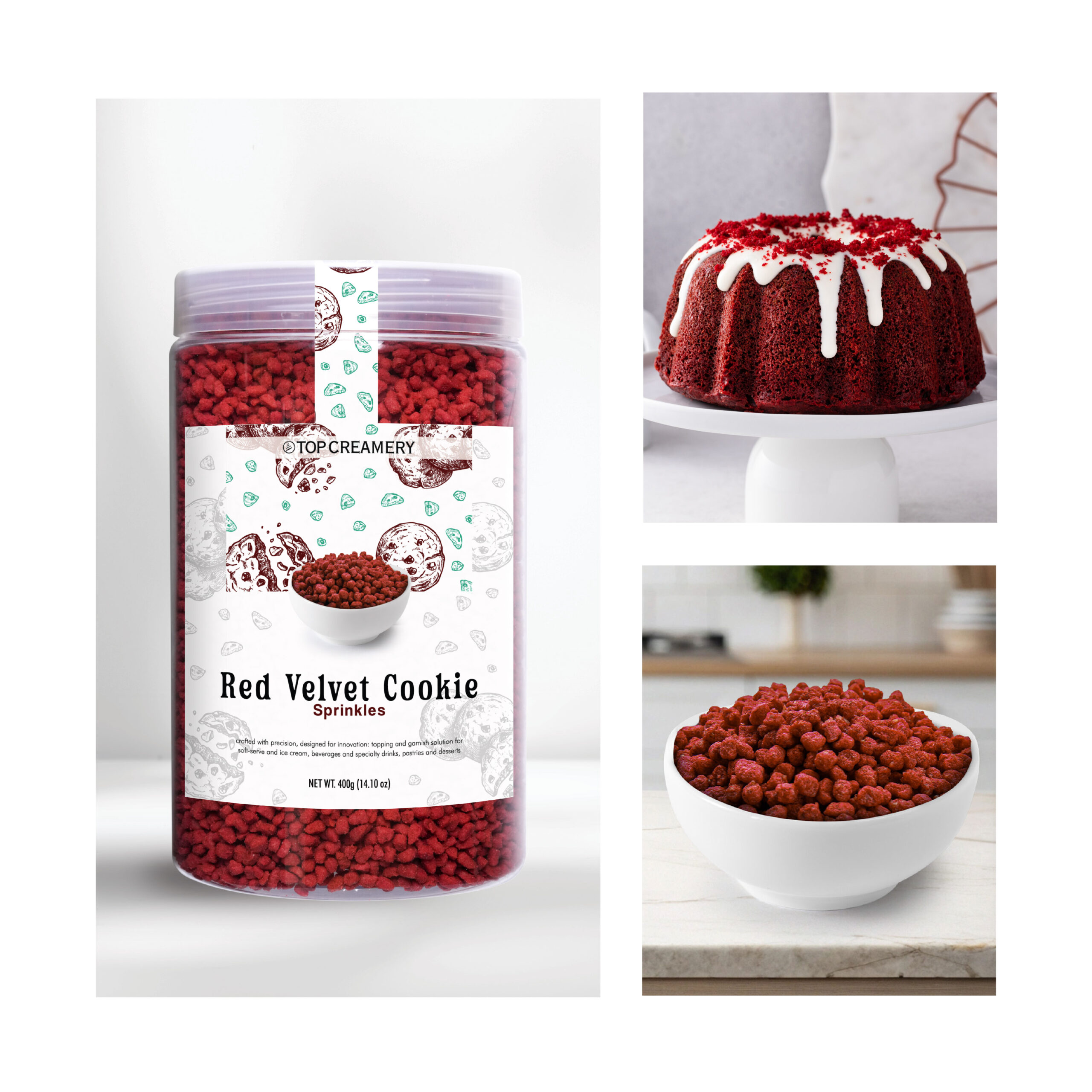 Sprinkle over soft-serve, gelato, or frozen yogurt for a visual flourish. Use atop whipped cream, creamy frappes, or mousse-based drinks. Excellent in dessert bars, dipped cones, and cakes with cream cheese frosting. This red velvet cookie topping for desserts works well in bakery trays, takeaway formats, and plated pâtisserie builds.