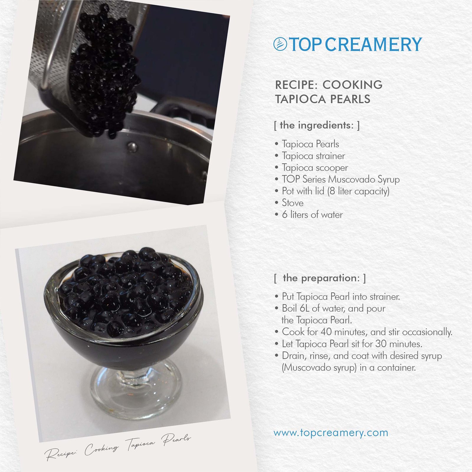 Boil 6L of water. Use a strainer to remove residue. Add tapioca pearls, stir after 15 seconds to prevent sticking. Wait for pearls to float, then cover and cook on medium heat for 40 minutes, stirring occasionally. Let soak with the lid closed for 30 minutes. Strain and rinse. Transfer to a container and coat with TOP Series Muscovado Syrup or preferred syrup.