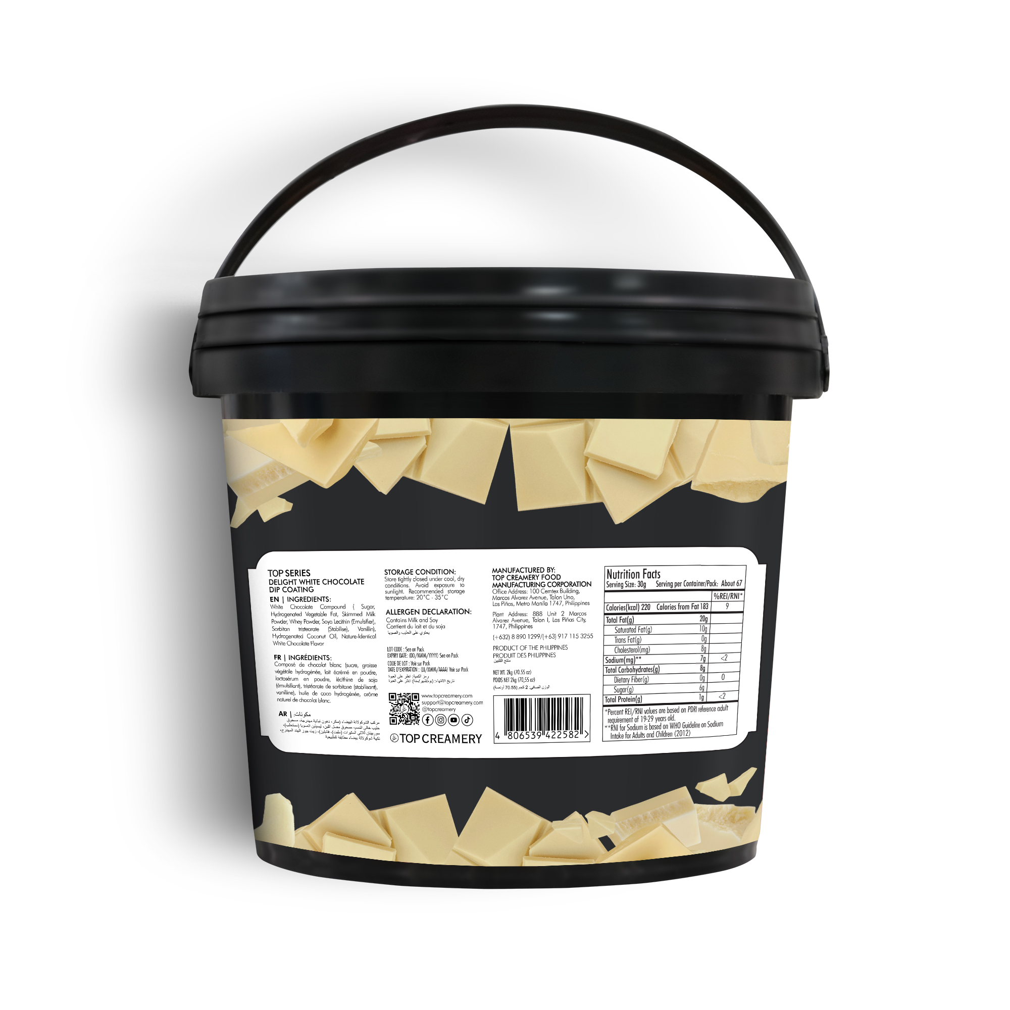 TOP Series Delight White Chocolate Dip Coating 2kg is a white chocolate dip coating for frozen desserts developed for chefs seeking clean sweetness and a smooth vanilla-cocoa butter profile. On pour, it flows with fluid precision; on contact with cold surfaces, it transforms into a delicate, crisp shell.