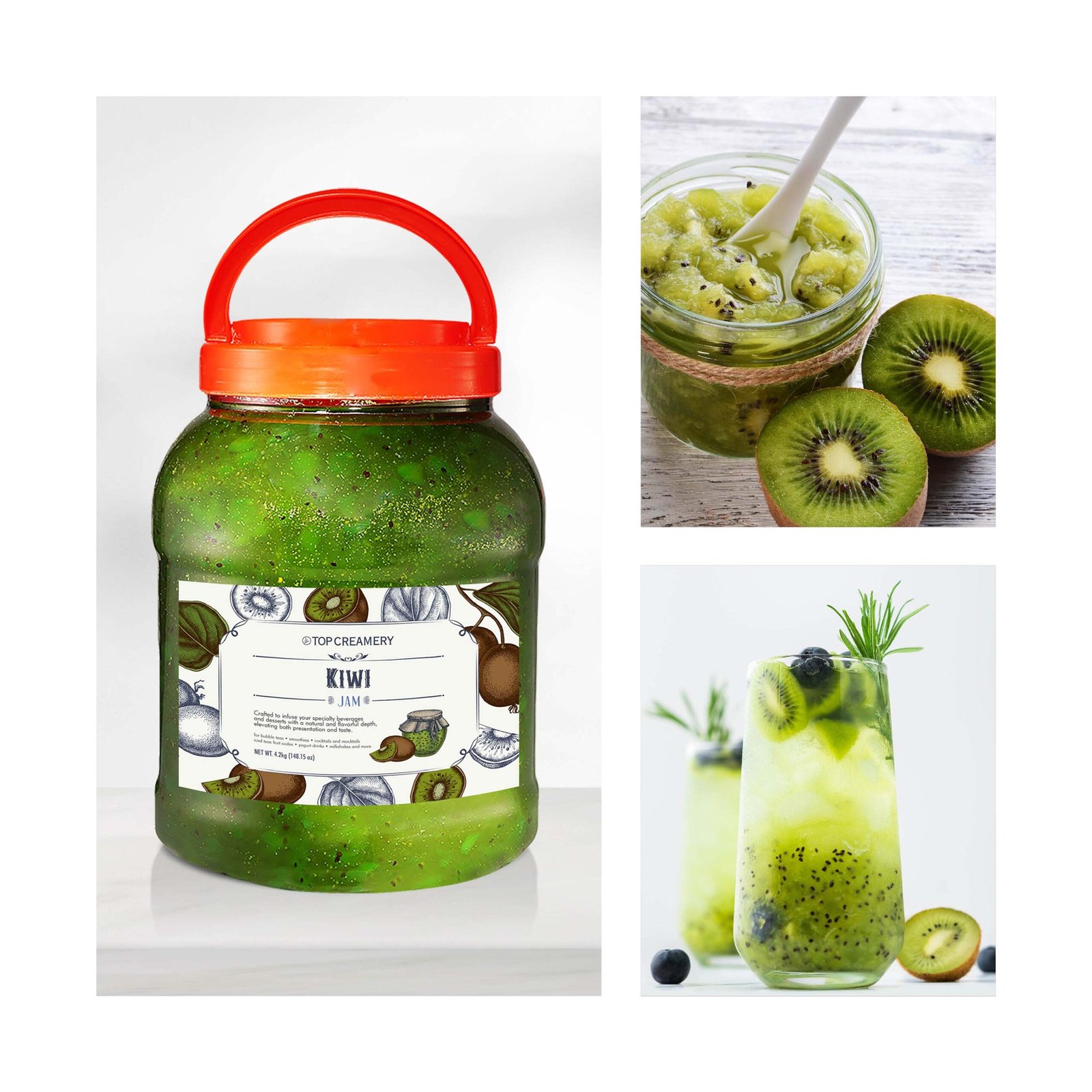 TOP Series Kiwi Jam 4.2kg is designed for multiple uses, including in bubble teas, smoothies, milkshakes, fruit sodas, and iced teas. It can also be used as a topping for pastries, cakes, and yogurt, adding a refreshing and colorful touch to any dessert. The easy-to-use jam can be stirred into beverages or spread on desserts to enhance both the flavor and presentation, providing businesses with a versatile product that meets the growing demand for exotic fruit flavors.
