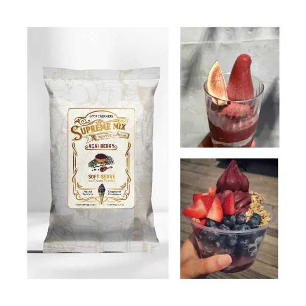 TOP Series Frozen Yogurt Reserve Edition Açai Berry Powder pairs Brazilian açai with a cultured yogurt base for clean tartness, deep berry notes, and a silky finish. A professional yogurt powder designed for fast service and refined texture in bowls, cones, smoothies, and parfaits.